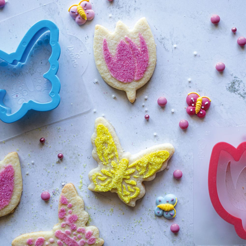 Két műanyag sütivágó, amely tökéletes sütik formázásához, cukormassza és rágógumi formák és díszítők készítéséhez, valamint négy élelmiszerbiztonságos műanyag sablon, amelyek tökéletesek háromdimenziós minták készítéséhez cukormázzal, vajkrémmel, porcukorral, kakaóporral, színes porokkal, spray-festékkel vagy airbrush-sal. A tökéletes süti eredmény érdekében lisztezd be a formát, mielőtt a tésztán használod.